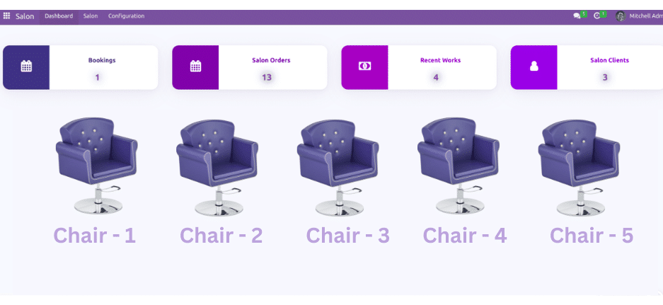 The dashboard provides a comprehensive view of all bookings, sales orders, recent work, and salon clients. Services can be booked in two ways: either through direct booking or online booking. The dashboard offers detailed insights into each chair, including its availability, current orders, and total daily earnings. Active orders for each chair are also displayed. By clicking on a chair, users can directly view its active orders. To adjust the settings of a chair, simply click on the settings icon located above the chair.