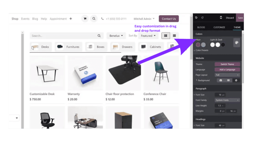 Businesses may customize the look and feel of their online stores with Odoo ecommerce’s feature-rich website builder. With the help of the website builder’s numerous design templates and customization options, businesses can create an eye-catching, professionally-designed online store that may even become their signature. With its drag-and-drop interface, businesses can easily add and modify website content, including product listings, images, and descriptions, without requiring technical expertise.
