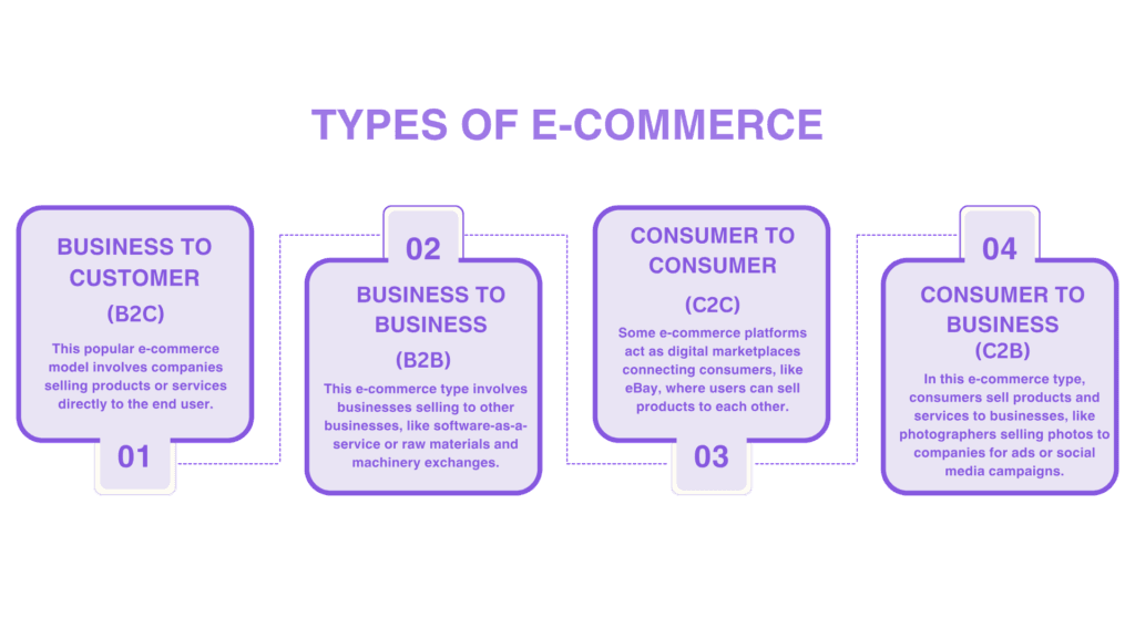 A business may sell to the government, other companies, or its clientele. Customers may also sell to other consumers, companies, or governmental organizations. Nonetheless, the electronic transactions that can occur over the internet are classified into four main categories under the term “e-commerce.”