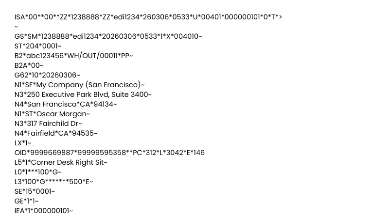 EDI 204 (Motor Carrier Load Tender) is a transportation EDI transaction used by shippers, brokers, or logistics providers to electronically tender freight loads to motor carriers. It communicates complete shipment details—such as pickup and delivery locations, schedules, equipment requirements, and cargo information—so the carrier can evaluate and accept or reject the load.
