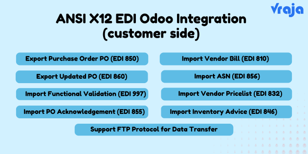 ANSI X12 EDI Integration for Odoo automates document exchange in Odoo ERP. Export purchase orders & import vendor bills, ASN, acknowledgements, inventory, & price lists via FTP.