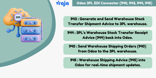 ANSI X12 EDI Integration for Odoo enables smooth data exchange with 3PL warehouses. Export 940/943 warehouse documents and import 944/945 responses for shipping and fulfillment.