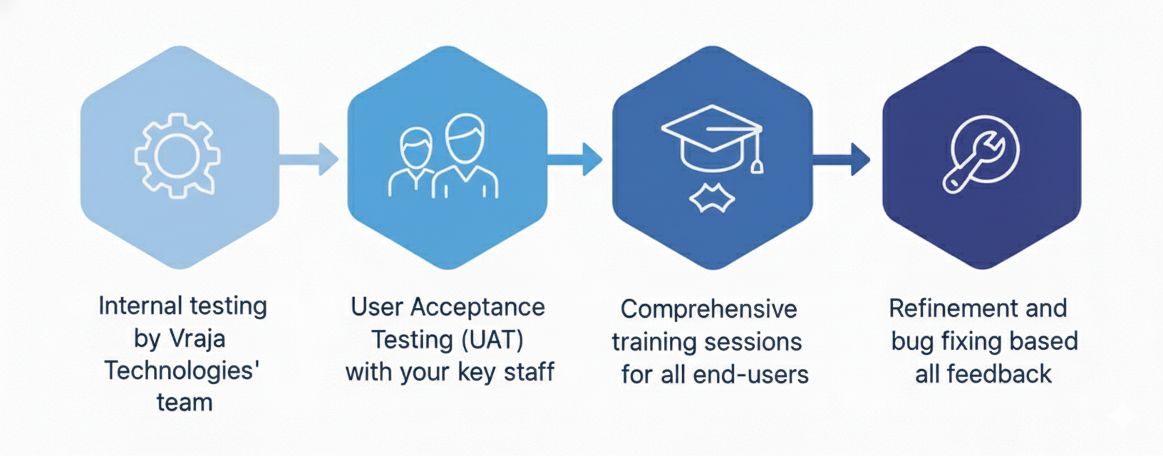 With your Odoo system configured and customized, this crucial phase focuses on validation and empowerment. Our goal is to ensure the system is robust, bug-free, and perfectly aligned with your business processes, while simultaneously preparing your team for a smooth transition. Through rigorous testing and comprehensive training, we make sure every user is confident and proficient, guaranteeing that your new Odoo environment is ready for optimal performance from day one.