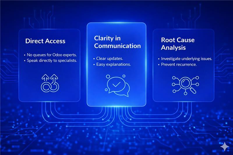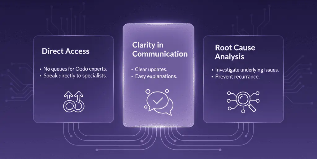 - Developers on Demand: When complex bugs or integration issues arise, your ticket is escalated directly to the senior Odoo developers who know your custom code best, ensuring faster and more accurate fixes.